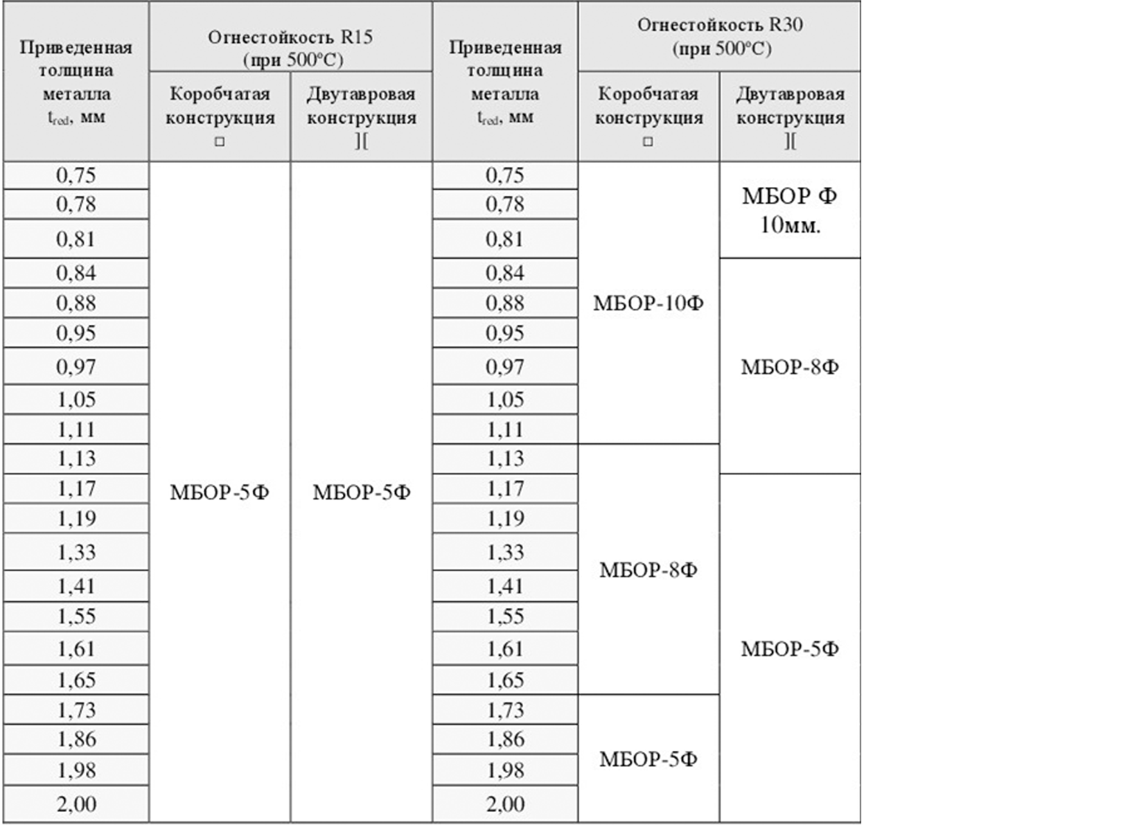 Сводная таблица толщин МБОР Ф (ТУ 23.99.19-018-08621635-2020) производства АО «ТИЗОЛ» для обеспечения требуемой огнестойкости конструкций ЛСТК коробчатого и двутаврового сечений, собранных из стальных холодногнутых оцинкованных эс (С) образных и сигма (Ʃ) профилей при критической температуре 500оС.